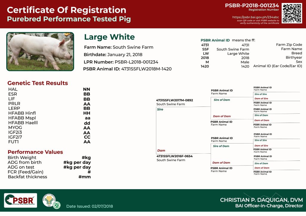 Purebred Certificate is an official document that certifies a pig’s superior genetic quality and performance capabilities, building upon the basic LPR registration by including comprehensive genetic marker analysis and individual performance data.